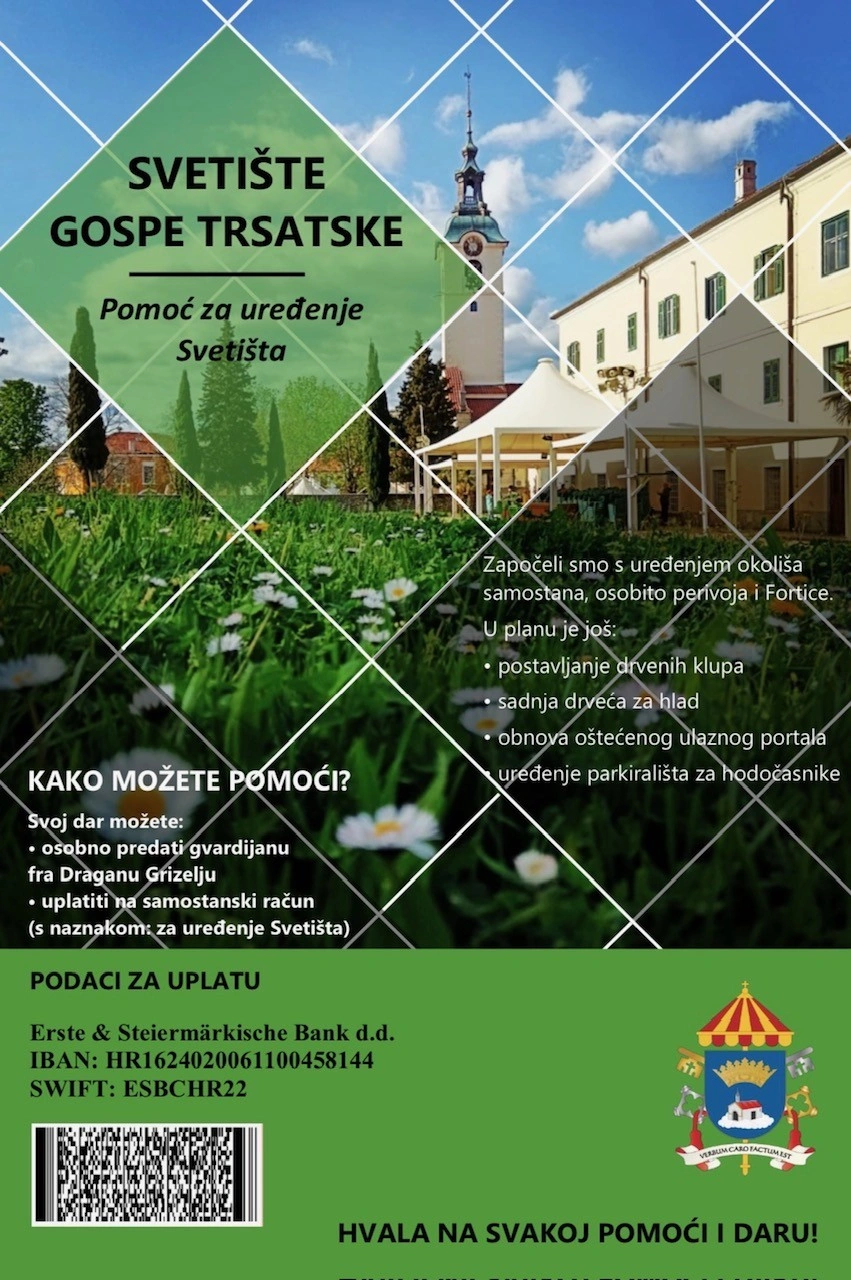 Stoga sve ljude dobre volje molimo za pomoć pri realizaciji navedenih radova u Svetištu. Koji ste u mogućnosti i želite svojim darom pomoći uređenje Svetišta, možete to učiniti tako da se osobno javite gvardijanu fra Draganu Grizelju ili da uplatite na samostanski račun s navedenom nakanom. Od srca zahvaljujemo na svakoj pomoći i daru!